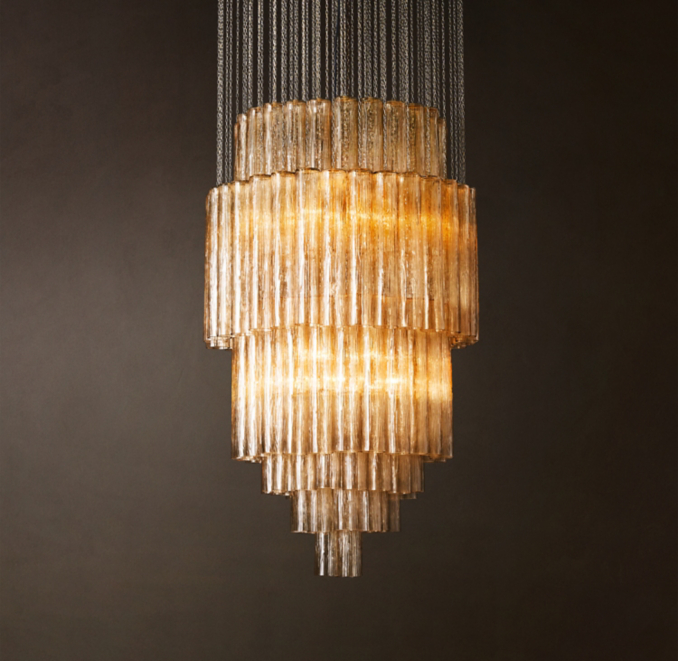 In the style of Venini, our reproduction of a Midcentury Modern Murano design commands a room. Suspended from a cascade of metal chains, the magnificent chandelier features concentric tiers of individually handblown tubular glass. Lit from behind, the textured, smoky-taupe cylinders cast a warm, moody glow.